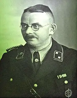 Otto Hoegelow (born 14 January 1895 in Lentzke/Fehrbellin) was a veteran of the I. World War. After the war he married his childhood friend, with whom he had three children. He joined the NSDAP, Nr. 128041 on 17 March 1939 and received the golden NSDAP party badge. He was an Oberscharführer, later Hauptscharführer (from 1938, the second highest rank of the service group of Unterführer with Portepee, also called 'Feldwebel' or 'Spieß') in the Schutzstaffel (SS) of the Waffen-SS. During World War II, he was employed as principal guard in Fort Albert (Alderney) on the island of Alderney, which belongs to the British island of Guernsey.[1][2][3]