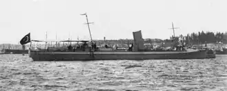 At the outbreak of World War I, she was already obsolete and of low combat value.[5] On August 29, 1914, the ship with a German officer, Oberleutnant zur See Frige on board left the Dardanelles and went under Imbros on a reconnaissance mission. The torpedo boat was stopped by British ships and the crew was informed that the Entente had begun a blockade of the Turkish Straits.[6] In 1915, the ship's depleted engine room allowed it to reach a top speed of 14 knots, and the crew size was increased to 43 (4 Germans and 39 Turks).[2] That year, one of the torpedo launchers was also dismantled, installing instead a single 47 mm caliber SK L/45 C/99 gun.[2]