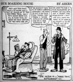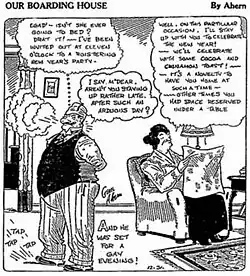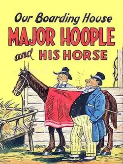 In 1921, Gene Ahern created the comic strip Crazy Quilt, starring the Nut Brothers, Ches and Wal. That same year, NEA General Manager Frank Rostock suggested to Ahern that he use a boarding house for a setting. Ahern initially used his own experiences as a boarder while a Chicago, Illinois, art student as grist for his comic mill, and featured the picaresque peccadilloes and bickering of its residents, presided over by the no-nonsense Martha Hoople.[2] Our Boarding House began September 16, 1921,[3] scoring success with readers after the January 1922 arrival of the fustian, blustery Major Amos B. Hoople, Martha's husband, who'd returned after some long sojourn.[1] "Hoople has been compared to the type created on-screen by W. C. Fields, but was probably closer to Falstaff," writes comics historian Maurice Horn. "A retired military man of dubious achievement like Shakespeare's [comic figure], he boasted of soldierly exploits that were perhaps not all invented, and his buffoonery sometimes concealed real pathos."[2] That character depth diminished as the comic became more popular, with Major Hoople becoming "the one-dimensional figure of fun most people remember" of the strip.[2] The primary boarders were the cynical Clyde and Mack, and the only somewhat more trusting Buster.[2]