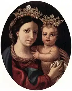 Originally, this Madonna was located at the chapel of St. Louis at the Jesuit Collegio Romano, where was known as "Our Lady of Confidence". When the Jesuits were suppressed in 1773, the college was given to the diocesan clergy for a seminary. It is believed she protected the seminarians from the Asiatic flu epidemic of 1837, which claimed many lives in Rome. In thanksgiving, the seminarians crowned Mother and Child with golden bejeweled diadems.[1] In 1913, the Roman Seminary relocated to the Basilica of Saint John Lateran complex.