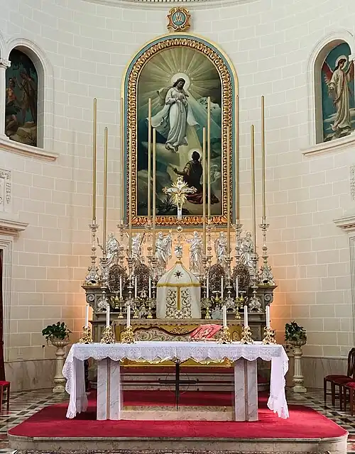 On June 12, 1959, with the consent of Mr. Feliċ Borg and with the approval of Archbishop Gonzi and the Provincial of the Capuchins at that time, the agreement was changed to change the title of the church to Our Lady of Lourdes. The next day, June 13, a temporary picture of Our Lady of Lourdes was placed in the church.On June 14, 1959, the painter profs. Ġuzeppe Briffa, from Birkirkara, started working on the draft of the new title and offered to do it free of charge. On December 17, 1959, the titular painting was finished, and the same painter, Briffa, was brought to the church. On December 20, 1959, the day on which the church was opened and blessed, Archbishop Michael Gonzi, after giving the sacramental blessing, unveiled and blessed the titular picture of Our Lady of Lourdes. On July 16, 1979, the work of gilding the frame of the titular frame began.[5]