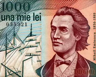 ![]() Eminescu alongside masts, detail of a 1991 1,000-lei banknote | |