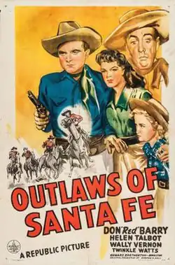 Outlaws of Santa Fe is a 1944 American Western film directed by Howard Bretherton and written by Norman S. Hall. The film stars Don "Red" Barry, Helen Talbot, Wally Vernon, Twinkle Watts, Charles Morton and Herbert Heyes. The film was released on April 4, 1944, by Republic Pictures.[1][2][3]