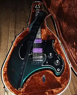 The Breadwinner was a solid body electric guitar made by the Ovation Guitar Company. It is one of the few solid body electrics the company ever made, and it was the first mass-produced American guitar to have active electronics.[1] It has an unusual ergonomic body made of mahogany and shaped something like an axe guitar. Although that is not the only reason for the body shape, the designer also considered balance and ergonomics.[2] The guitar has either two toroidal single-pole pickups (early models) or two mini-humbucker pickups, a master volume and tone control (which boosts or cuts treble, and is "normal" in the centre position), a three way pickup selector (configured as Neck, Bridge, Neck + Bridge Out of Phase) and a notch filter switch for filtering out Mid Frequencies.