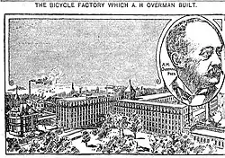 Overman were the first American manufacturers of the safety bicycle.[1] In 1888 the company began making its own bicycles, with a staff of about thirty men.[2] At its height, the factory employed about 1,400 men in five buildings.[2] The factory produced 80,000 bicycles per year, the only bicycle factory at the time which made the entire bicycle.[2]