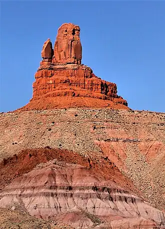 Owl Rock is a red spire composed of Jurassic Wingate Sandstone which is a hard, fine-grained rock which is great for rock climbing, in contrast to the towers and buttes in nearby Monument Valley which have a different composition, de Chelly sandstone. Owl Rock stands atop Tyende Mesa which is formed of the Triassic Chinle Formation. The Owl Rock Member of the Chinle Formation, composed of cherty limestone and limestone conglomerate beds alternating with claystone, mudstone, and siltstone beds, forms the upper half of the mesa, and it overlays the Petrified Forest Member of the lower half.[7] The Owl Rock Member is best exposed at its type locality near the base of Owl Rock. Here the member crops out and the resistant limestone beds form a series of jutting ledges that serve partly in protecting the underlying strata. The limestone beds are very resistant to erosion, forming thin ledges interrupting the slopes weathered from the dominant siltstone interbeds. The Owl Rock Member ranges in thickness from approximately 120 to 166 feet, and at Owl Rock the member is 166 feet thick.[8]