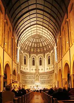 The church was designed by Joseph Hansom in a Gothic Revival style.[6] Much of the original interior decoration was painted over in the 1970s, and the altar moved forward. The building is being gradually restored as part of the Oratory's "Reaffirmation and Renewal" campaign, which commenced fundraising in 2007.[7] Two 'lost' murals by Gabriel Pippet were restored in 2024 by Cliveden Conservation.[8]