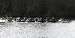 The first women's rowing event between Oxford and Cambridge was held on 15 March 1927 on The Isis in Oxford.[9] This was not solely a race in the years up to 1935, the two boats were not on the river together and were judged on both their speed and their "steadiness, finish, rhythm and other matters of style". The Times reported that "large and hostile crowds gathered on the towpath" and The New York Times stated "a crowd of fully five thousand persons was on hand as a willing cheering section".[6][14] The race covered a distance of approximately 12 mile (0.80 km) over which the crews were judged on their style while rowing downstream and their speed while rowing back upstream.[15] Reports differ as to the judges' opinions on style: one suggests they failed to agree on a winner,[15] another indicates that they deemed the style of each crew to be equal.[16] As a result, the judges based their decision on speed:[15] the race was won by Oxford in a time of 3 minutes 36 seconds, beating Cambridge by 15 seconds.[9]