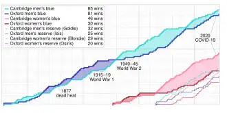 7. ^ a b c d "A brief history of the Oxford-Cambridge Varsity event – from the perspective of women". The Telegraph. 13 March 2015. Archived from the original on 15 April 2015. Retrieved 11 April 2015.