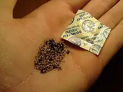 When an oxygen absorber is removed from its protective packaging, the moisture in the surrounding atmosphere begins to permeate into the iron particles inside of the absorber sachet. Moisture activates the iron, and it oxidizes to form iron oxide. Typically, there is required to be at least 65% relative humidity in the surrounding atmosphere before the rusting process can begin. To assist in the process of oxidation, sodium chloride is added to the mixture, acting as a catalyst or activator, causing the iron powder to be able to oxidize even with relatively low humidity. As oxygen is consumed to form iron oxide the level of oxygen in the surrounding atmosphere is reduced. Absorber technology of this type may reduce the oxygen level in the surrounding atmosphere to below 0.01%.[2][3] Complete oxidation of 1 g of iron can remove 300 cm3 of oxygen in standard conditions. Though other technologies can remove more, iron is the most useful as it does not cause odor like sulfur compounds or passivate like aluminium compounds. Many other alternatives are not food safe.[8] The moisture requirement of iron-based scavengers makes them ineffective in moisture sensitive applications.