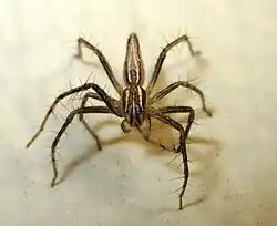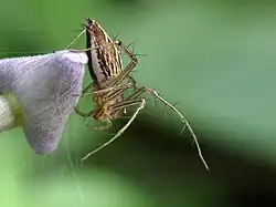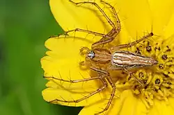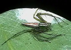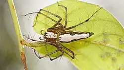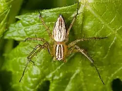 Oxyopes is a genus of lynx spiders found worldwide. It includes arounds 300 species and is classified under the lynx spider family Oxyopidae.[1][2] Like other lynx spiders, they are easily recognizable by the six larger eyes arranged hexagonally on top of the head (prosoma), with the remaining smaller two eyes in front. They are also characterized by long spine-like bristles (setae) on their legs.[3] They are ambush predators, actively hunting prey by sight. Though they produce and use silk, they do not build webs to capture prey.[4]