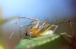 Oxyopes macilentus, sometimes known as the lean lynx spider, is a species of lynx spiders from East Asia, South Asia, Southeast Asia, and northern Australia. They are active predators, hunting invertebrates (including other spiders) among vegetation. They are especially common in grassy areas and rice fields. Their bodies are characteristically long and thin, about four times as long as it is wide. Their body color ranges from pale white to yellow, orange, or green; with a pattern of black, orange, and white longitudinal lines. Females have a maximum body length of 10 mm (0.39 in), while males grow to 9 mm (0.35 in).[1][2][3]