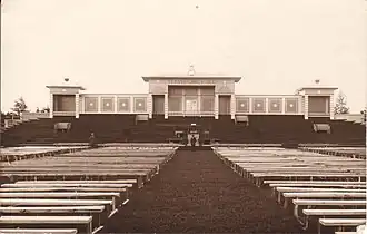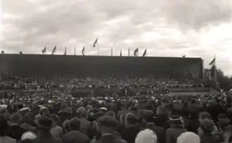 The stadium was officially opened on 14 July 1929. The wooden grandstand, which was also built to host singing festivals, was able to seat around 700 people and was labelled as the 'finest of the Baltic states' due to its neoclassical architecture.[5] However, the grandstand was set on fire on 9 February 1933 and the perpetrators were never caught.[4]