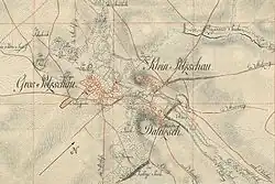The first mention was as Beschowe in 1206, the distinction was added, "Groß" (great) in 1514, and "Klein" (small) in 1497. Dahlitzsch was first mentioned as Talzschicz in 1469.[1] Formerly an independent municipality, it was merged into the municipality of Espenhain in 1995.[2] Espenhain was merged into the town of Rötha in 2015.[3]