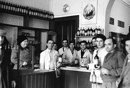 With Călinescu, Teodoreanu worked on La Roumanie Nouvelle, the French-language communist paper, where he had the column Goutons voir si le vin est bon ("Let's Taste the Wine and See if It's Good").[128] From 1957 to 1959, he resumed his food chronicles in Magazin, while also contributing culinary reviews in Glasul Patriei and other such communist propaganda newspapers.[129] He was a virtual employee or "technical adviser" of Bucharest's Continental Restaurant, for which he wrote short poems that doubled as advertorials.[130] Alongside Victor Tulbure and Mihai Beniuc, he gave poetry readings for the sporting staff of CS Dinamo București.[131] According to literary reviewer G. Pienescu, who worked with Teodoreanu in the 1960s, the Glasul Patriei collaboration was supposed to grant Păstorel a "certificate of good citizenship".[110] Under pressure from communist censorship, Teodoreanu was re-configuring his literary profile. Dropping all references to Western cuisine, his food criticism became vague, reusing agitprop slogans about "goodwill among men", before adopting in full the communists' wooden tongue.[132] Although the country was still undernourished, Păstorel celebrated the public self-service chain, Alimentara, as a "structural transformation" of the Romanian psyche.[133] Meanwhile, some anti-communist texts, circulated by Teodoreanu among the underground dissidents, were intercepted by the authorities. Those who have documented Teodoreanu's role in the development of underground humor note that he paid a dear price for his contributions.[121][134]
