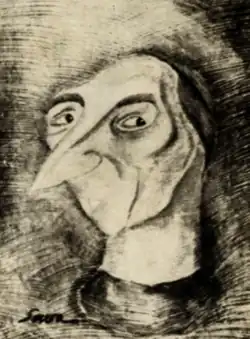 Un porc de câine pushed the jokes a little further, risking to be branded an obscene work. According to critic Perpessicius, "a witty writer can never be an obscene writer", and Păstorel had enough talent to stay out of the pornographic range.[186] Similarly, Cioculescu describes his friend as an artisan of "libertine humor", adverse to didactic art, and interested only in "pure comedy".[187] In his narrator's voice, Păstorel mockingly complains that the banal was being replaced by the outstanding, making it hard for humorists to find subject matters. Such doubts are dispelled by the intrusion of a blunt, but inspirational, topic: "Can it be true that mayweed is an aphrodisiac?"[188] In fact, Un porc de câine expands Teodoreanu's range beyond the everyday, namely by showing the calamitous, entirely unforeseeable, effects of an erotic farce.[189] The volume also includes a faux obituary, honoring the memory of one Nae Vasilescu. This stuttering tragedian, whose unredeemed ambition was to play Shylock, took his revenge on the acting profession by becoming a real-life usurer—an efficient if dishonorable way to earning the actors' fear and respect.[190]