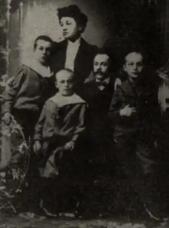 The Teodoreanu brothers were born to Sofia Muzicescu, wife of the lawyer Osvald Al. Teodoreanu. The latter's family, originally named Turcu, hailed from Comănești; Osvald's grandfather had been a Romanian Orthodox priest.[1] Sofia was the daughter of Gavril Muzicescu, a famous composer from Western Moldavia,[2][3][4][5] and herself a teacher at the Music and Declamation Conservatory in Iași.[6] When Păstorel was born, on July 30, 1894, she and her husband were still living at Dorohoi. Ionel (Ioan-Hipolit Teodoreanu) and Puiuțu (Laurențiu Teodoreanu) were his younger siblings, born after the family had moved to Iași.[4] Osvald's father, Alexandru T. Teodoreanu, had previously served as City Mayor,[7] while an engineer uncle, also named Laurențiu, was the first manager of the original Iași Power Plant.[8] The Teodoreanus lived in a townhouse just outside Zlataust Church. They were neighbors of poet Otilia Cazimir[5][9] and relatives of novelist Mărgărita Miller Verghy.[10]