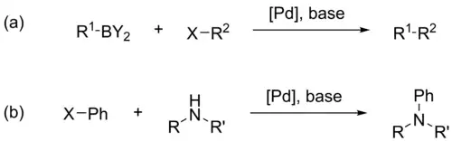 PEPPSI catalyze various cross-coupling reactions including Negishi coupling,[15] Suzuki coupling, Sonogashira coupling, Kumada coupling,[18] and the Buchwald–Hartwig amination[6] as well as aryl sulfination[19][10][6] and the Heck reaction.[1][20] In Negishi coupling, PEPPSI promotes reaction of alkyl halides, aryl halides or alkyl sulfonates with alkylzinc halides,[21] and the important advantage of PEPPSI over alternative catalysts is that the reaction can be carried out in a general chemical laboratory, without a glove box. PEPPSI contains palladium in the +2 oxidation state and is thus a "precatalyst", that is the metal must be reduced to the active Pd(0) form in order to enter the cross-coupling catalytic cycle. This is usually achieved in situ in the presence of active transmetalating agents such as organo-magnesium, -zinc, -tin, or -boron reagents.[7] Once activated, the NHC-Pd(0) species becomes rather air-sensitive.[15][1][22][23]
