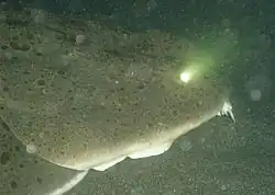 During the day, Pacific angelsharks are almost never seen in the open, instead resting motionless on the sea floor buried under a thin layer of sediment that disguises their outlines. At night some individuals remain motionless, waiting for prey, while others may be encountered on the bottom unburied or actively swimming.[10] Large sharks, including the great white shark (Carcharodon carcharias) and the broadnose sevengill shark (Notorynchus cepedianus), and the northern elephant seal (Mirounga angustirostris) are known to consume Pacific angelsharks.[3][11] Known parasites of this species include the copepod Trebius latifurcatus, which infests the skin, the myxosporidian Chloromyxum levigatum, which infests the gall bladder, and the tapeworm Paraberrapex manifestus, which infests the spiral valve intestine.[12][13][14] The leech Branchellion lobata may be attached around this shark's cloaca, inside the intestine, and even inside the uterus and on developing embryos.[15]