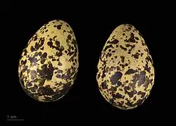 The Pacific golden plover breeds in Arctic tundra areas of Siberia and western Alaska. Males usually arrive first, possibly returning to, and defending, the same territory each year. Some males and females appear to arrive paired.[10] Females have been observed searching for breeding partners on the tundra. The male builds a nest of lichen, moss, and grasses, in shallow scrapes on the ground in a dry open area. The female lays 4 eggs, buff-colored with splotches of black and brown. Both male and female share incubation, care of young, and defense from foxes and avian predators.