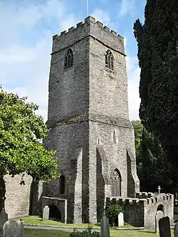 The church of St Petroc is one of four said to have been founded by the saint, the others being Little Petherick (or St Petroc Minor), Parracombe and Bodmin. It is quite large and mostly of 13th- and 14th-century date. There is a fine 15th-century font of Catacleuse stone; the pulpit of c. 1530 is also of interest. There are two fine monuments to members of the Prideaux family (Sir Nicholas, 1627. and Edmund, 1693): there is also a monumental brass of 1421.[18] The benefice is a rectory: Padstow (St Petroc), St Merryn and St Issey with St Petroc Minor now form a group within the deanery of Pydar.