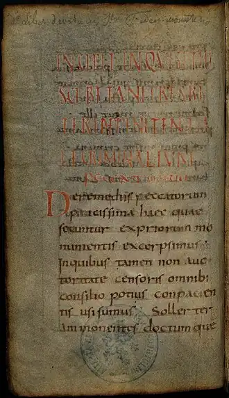 ![]() Folio 96v from the Sélestat manuscript (Cod. 132), showing the beginning of the Paenitentiale Bedae | |