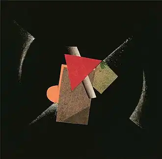 This is a square painting of small dimensions whose center is dominated by multi-colored geometric elements on a black background. It is based on the principles of suprematism and is reduced to primary geometric shapes - triangle, rectangle, polygon and cone. In addition, it is reduced to the primary colors - red, yellow, blue and their derivatives which are projected on a black background.