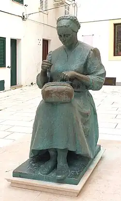 Pag lace is notable for its unique origins, believed to trace back to Mycenae, and has been preserved in the city of Pag since ancient times. The earliest documented records of Pag lace date back to the 15th century, mentioning the involvement of the Benedictine nuns from the monastery. Before, there were no stencils or blueprints for making,[2] the work being entirely empirical.[3] The way they were made and their pattern was passed from generation to generation, from mother to daughter by word of mouth and practical work. Benedictine Monastery of St. Margaritas is also responsible for spreading Pag lace, which they sold to Venice or Vienna.[4] The Benedictine sisters were the main initiators of lacemaking and the lace school in Pag. Today, the monastery has a collection of over a hundred exhibits that has been preserved and collected for over 150 years.[2]