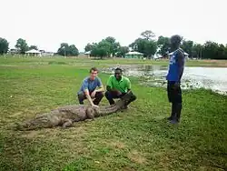 Paga Crocodile Pond is a sacred pond in Paga in the Upper East Region of Ghana, which is inhabited by West African crocodiles. Due to the friendliness of the reptiles, it has become popular among tourists and the pond is now reliant on tourism to ensure the population of crocodiles remain fed and healthy. It is also known as Chief's pond.[1]