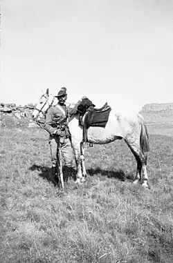 After this inconclusive engagement, Carrington gave up the attempt to reach Brakfontein and returned to Mafeking. Paget's Horse had to fight a dismounted action to clear a Boer force blocking the road back, and Maj Paget was slightly wounded. Paget's Horse went back to its camp at Ottoshoop and spent the following weeks patrolling the road between Zeerust and Lichtenberg, fighting three separate engagements with parties of Boers. In one of these Paget's Horse had to saddle-up and gallop out of Ottoshoop to relieve a detachment of the Victorian Rifles pinned down on a kopje. On arrival they dismounted and fired volleys of suppressive fire at the Boers hidden on the opposing kopje, until the Boers withdrew.[24] A large detachment of Paget's Horse was sent by train to Vryburg to join a relief column for Schweizer-Reneke, which was being besieged by the Boers. The march was unopposed and the unit spent a few days patrolling the surrounding country, experiencing a few contacts with small parties of Boers. Paget's having returned to Vryburg, the Boers once again besieged Schweizer-Reneke. This time the unit had to escort a slow convoy of ox-carts, taking a week to cover 35 miles (56 km). This work was typical of the Guerrilla warfare that characterised the next two years of the war. After two such convoys, the detachment returned to the rest of the battalion at Mafeking.[25]