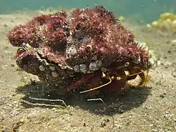 Pagurus sinuatus is a large species of hermit crab, and normally inhabits rounded gastropod shells. It is distinguished from other hermit crab species in Australia by its solid, hairy chelipeds (claw-bearing appendages), although there may be further undescribed species within its range.[2] The hermit crab's body is orange and red, with patches of red or violet colour. The pereiopods (walking legs) are banded.[2] It reaches a maximum "shield length" (distance from the rostrum to the cervical groove on the carapace) of 14.5 millimetres (0.57 in).[3]
