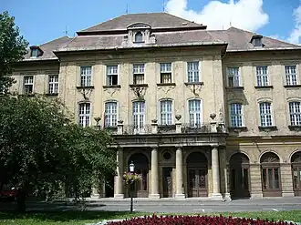 The Palace of Music (Zenepalota) is a building in Bartók square, Miskolc, Hungary. It is in the Béla Bartók Secondary School and the Béla Bartók Music Institute (a faculty of the University of Miskolc.) Designed by Gyula Waelder in Neo-baroque style, it was constructed between 1926 and 1927. USA loans -- just like that of the Hotel Palace in Lillafüred and the Market Hall on Búza tér -- financed the project. The Palace plays an important role in the cultural life of the city. It has a large concert hall where concerts are regularly held.