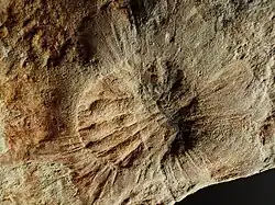 The organisms take the form of a rounded, dome-like bag, 7–68 mm in diameter, with an uneven margin. Radial grooves define sac-like compartments within the bag. The radial pattern has an element of bilateral symmetry. A stalk emerges from the central point of some specimens, at the top of the organism; in life, it probably extended into the water column. Ray-like filaments radiate outwards from the edge of the bag.[2] Some structures in the organism have been interpreted as spicules.[1][4]