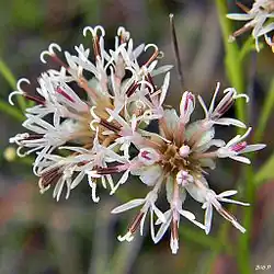 Palafoxia integrifolia is a herbaceous annual plant with pinkish-white disc flowers arranged in inflorescences. It has glossy, alternating leaves which elongate on the lower portion of the stems and more linear at the top.[3] The stems of P. integrifolia are less woody than other species of palafox, making it prone to drooping.[3]