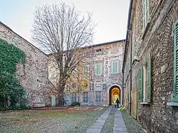 The inner courtyard of the palace consists of a portico covered by rib vaults and supported by columns of Tuscan order made of Botticino marble:[5][1] the same courtyard is then divided into five arcades in the two side arms and six in the central body; in the latter, the even number of bays implies the unusual solution of the fullness of a column on the axis, instead of the emptiness of an arch.[5] The aforementioned columns, moreover, support eyebrowed round arches, while on the upper floor there are Ionic lesenes in which simple windows are inserted; the whole is then concluded by a string course with conspicuous corbels.[5] The architectural layout, on the whole, has been attributed by Fausto Lechi to the work of the Brescian architect Lodovico Beretta,[1] as asserted in numerous other works by local scholars.[20][21]