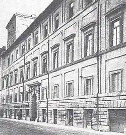 The first palace on this site was erected between 1517 and 1520 by Cardinal Francesco Armellini, possibly after a project of Giulio Romano or his pupils.[3] Armellini, born in Perugia, was a skilled financier.[4] After moving to Rome, he became immensely rich and was appointed Cardinal and counselor by Pope Leo X Medici (r. 1513–21), who adopted him.[5] Chief of the Medici party in Rome, after having risked to lose all his patrimony during the reign of Pope Adrian VI (r. 1522–3), he became treasurer under his successor Clement VII Medici (r. 1523–34).[5] Armellini was indirectly responsible of the Sack of Rome in 1527, since in 1525 he unwisely advised the Pope to discharge almost all his soldiers, leaving the city almost without defense.[5] On 6 May 1527, the Landsknechts of Holy Roman Emperor Charles V burst into the city pulling down a wall of his palace's garden while he was trying to bury there his jewels and the treasure of the pope.[6] The palace was pillaged by the soldiers, and Armellini was barely able to escape to Castel Sant'Angelo, lifted up inside a basket.[5][6] The palace erected by the cardinal was luxurious, served by 130 servants, and was decorated by artists like Martino da Parma, Giovenale da Narni and Anderlino da Mantova.[5]