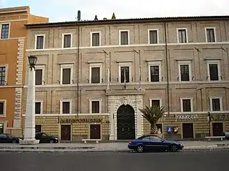 In 1939, during the works for the opening of Via della Conciliazione, the palace, which until that time had its main front on the Borgo Vecchio road, escaped destruction, but was modified according to a project of Marcello Piacentini and Attilio Spaccarelli.[10] This entailed the reduction of the number of windows from twelve to eight, the shortening of the yard (which was a typical example of Renaissance ring yard) and the destruction – among other things – of the east wing with the monumental staircase and the angular tower.[10][11] During the German occupation of Rome in World War II, the palace hosted many people (most of them Jews) escaping the Germans.[10] These had been hidden there by the second superior general of the Salvatorians, father Pancrazio Pfeiffer, who was also instrumental in the decision to declare Rome an open city.[10] Between 1944 and 1946 another wing of the building was erected along Borgo Santo Spirito.[10] In 2004 a part of the palace was transformed into a hotel, and as of 2015 the building is still owned by the General Curia of the Society of the Divine Savior.[12]