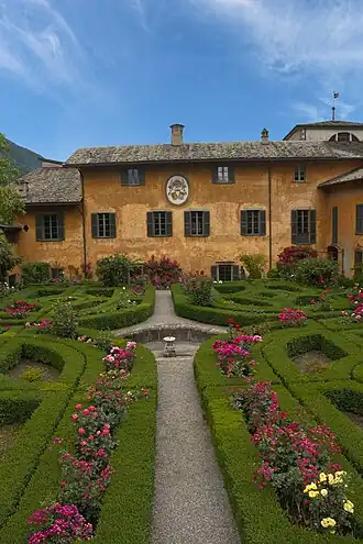The Italian Garden of the Palazzo Salis is a rareness in the alpine ambience of northern Italy. The current situation is the result of different phases and changes from the 17th century to the second half of the 19th century. The fondness for beautiful gardens of the family Salis is well documented even in other residences. The central element of the garden is a fountain surrounded by four box hedges that create a maze of evergreen which encloses varieties of roses. The impressive cedar of Lebanon, most likely planted in the 1830s is another highlight of the garden.