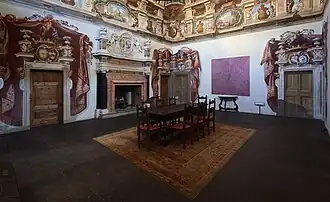 The then rooms surrounding the “Courtyard of Horses” are predominantly decorated with marvellous frescoes from the second half of the 17th century, the construction period of the Palazzo. Just the Main Hall (salone d‘onore) was redecorated in the second half of the 18th century, because of fire damages. This decoration work was done then by Antonio Cucchi for the painting of the ceiling and by Ferdinando Crivelli for the prospective architecture. An outstanding work of art, even all over the Valtellina, and for sure the most important room of the Palazzo is the so-called Saloncello. The decoration system of this hall reflects all the levels of interests of the family Salis. The importance of the family network itself is clearly shown by the imposing fireplace made in stucco, which represents the marriage between Giovanni Stefano Salis and his first wife Katharina von Wolkenstein. The political relevance of the Salis got described by the numerous coat of arms of important families (e.g. Medici, Borromeo, Visconti) the Salis family had contact with. But most impressive is the decoration of the ceiling. Thanks to the precision and quality of the illusionistic design as well as to the very thinly vaulted ceiling the illusion of a real architecture which opens to the sky works in a perfect way (Trompe-l’œil). On the medallion in the centre of the ceiling there is a representation of Bacchus, a hint of the economic base of the building as a centre of wine-production and wine-trading.