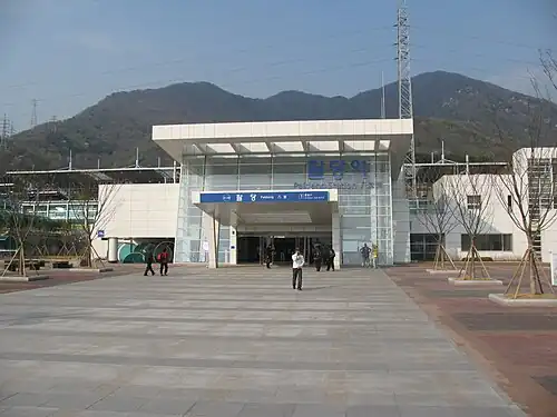 Paldang Station (Korean pronunciation: [pʰalt͈aŋ]) is a station on the Gyeongui–Jungang Line, located in the city of Namyangju by the northern banks of the Han River. Although it is one of the older train stations in Korea (built prior to the 1945 liberation), the area around the station is not developed to a great degree.