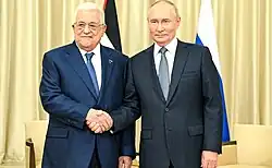 In October 2022, during a meeting with Putin in Kazakhstan, Abbas dismissed the US's role in the Israeli–Palestinian conflict and expressed his desire for Russia to play a more central role as mediator, provoking criticism by Washington.[34] A senior Palestinian diplomat told Arab News that Russia "is a great country, friendly and supportive of the rights of the Palestinian people, and seriously supportive of its cause."[35]