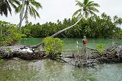 On November 7, 1802, the ship Palmyra, under Captain Cornelius Sowle (sometimes spelled "Sawle"), was shipwrecked on the reef, which took the vessel's name.[32] Lacking a navigable boat passage through the reef from the sea, it had never been inhabited. A lack of archaeological surveys on the atoll leaves the question of habitation before European contact open. As a result, no marae, basalt artifacts or evidence of Polynesian, Micronesian or other pre-European native settlements before 1802 have been reported on Palmyra.[33] At the time of his discovery, Captain Sowle wrote: