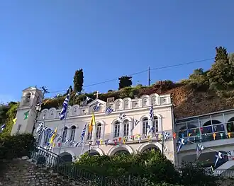 Panagia Trypiti (Greek: Παναγία Τρυπητή) is a historic sacred shrine of Theotokos in the town of Aigio, Greece. It is one of the most important Orthodox shrines of pilgrimage in Greece. The shrine is dedicated to the Mother of God of the Life-giving Spring. It is built on a steep cliff almost 30 meters high, near to sea. The many and impressive miracles which occur through the intercessions of the Virgin Mother have consecrated the church in the conscience of the faithful as a national shrine. Thousands of believers, from all over Greece, arrive at Aigio on Bright Friday every year, to get Panagia's grace and to get Her blessing. In the 14th volume of the French monthly magazine Revue des deux Mondes of the year 1876 it is mentioned that it was a big fest for the people of Aeghion[1] "grande fête locale à Aigion ... Dès le matin, tous les habitans, hommes, femmes, enfans, s'y rendent en pèlerinage; puis tous reviennent ensemble au milieu des fusillades et des détonations des varellota (petit baril)". It even mentions the use of firecrackers that day. This day every year there is a procession of the Holy Icon through the streets of Aigio and it is an official religious holiday (recognized as an official holiday by a Royal decree of 8 May 1933). The name Trypiti comes from the Greek word tripa (Greek: Τρύπα) meaning hole, cave, because the miraculous icon of Panagia was found in a hole in the rock. In the narthex of the church (which is on the ground floor) there is a spring of water (Greek: Αγίασμα).The faithful drink this water as a blessing since it is believed that it works miraculous cures.