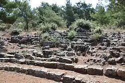 Wiegand's site has been for many years identified as the Panionion. It was enclosed by a temenos wall, of which one to three courses can still be seen, with an entrance from the west. In the central area can be seen evidence of a 17.5 by 4.25 m (57.4 by 13.9 ft) rectangular stone, presumed to be the altar of Poseidon, dated from the end of the 6th century BC. At the foot of the hill, 50 m (160 ft) southwest of the altar, is a small theatre or odeum. It is 32 m (105 ft) in diameter, a little bit more than semicircular, with 11 rows of seats, cut into solid rock, and is presumed to be the council chamber for the meetings of the Ionian League. It dates from the 4th century BC, when the Ionian League and the Panionia were revived. Between the sanctuary and the council chamber is a large cave, although what if any cult function it may have had is unknown. Ancient sources mention sacrifices,[6] but no temple, and none has been found.