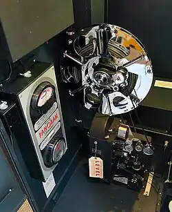 The Panoram was conceived and produced by the Mills Novelty Company of Chicago[3] under several patents, including 123,473 and 2,286,200,[4][5] which involve the cabinet design and endless reel workings. Development took place in the late 1930s with production and sales beginning in 1940.[6] A Grand Premiere took place on September 16-19, 1941, in Hollywood, California.[7] The company wrote over $3 million in Panoram orders that week.[6] The Panoram used RCA projectors, amplifiers, and speakers. The successful launch of the Panoram allowed for the largest single order of these RCA products up to that time.[8]
