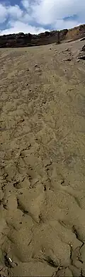 In order to reach the beach after crossing the pastureland, one has to climb down the tuff ring.[19][20]