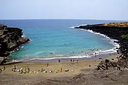 Papakōlea Beach (also known as Green Sand Beach or Mahana Beach[1]) is a green sand beach located near South Point, in the Kaʻū district of the island of Hawaiʻi. It is one of only two green sand beaches in the world, the other being Punta Cormorant on Floreana Island in the Galapagos Islands[2] It gets its distinctive coloring from olivine sand eroded out of the enclosing volcanic cone (tuff ring).[3]
