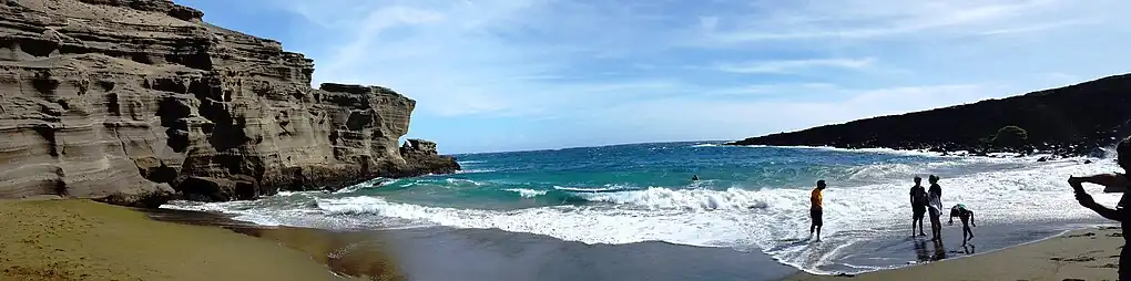 The formation of the tuff ring is currently a point of contention, with some arguing that lava flowing into the sea was suddenly cooled, forming an edifice on the coastline (a littoral cone) and others noting that the cone was most likely too far away from the ocean at the time of formation (sea level was much lower during the last Ice Age, when the cone formed) to make such an event possible.[5] Regardless of how it was formed, according to the United States Geological Survey, the last lava flow in the area ended over 10,000 years ago, making the area one of the more stable features in the geologically turbulent Kaʻū region.[14] As such, the geologic history of the site can be seen in the rock surrounding the beach and bay, which are not subject to erosion and thus display geologic layers formed by previous eruptions, lava flows, and other volcanic events.[15] In addition, the current patterns of erosion can be seen first-hand, as only the portions at the bottom of the tuff ring collapse have been subject to the waves and turned into green sand; the remaining portions appear gray.[16]