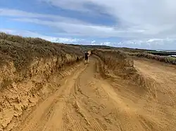 The beach is located about 3 miles (5 km) east of Ka Lae (known as South Point) on the island of Hawaiʻi.[17] It is surrounded by pasturelands and is only legally accessible by foot. The paths are rugged due to both illegal vehicular traffic and erosion. The land owner, the Department of Hawaiian Home Lands,[18] has attempted to restrict vehicular traffic in the area since 2016. However, illegal vehicular traffic has continued despite the measures. The vehicles have created ruts in the soil that reach well over 8 feet deep as shown in the photo below from December 20, 2020.