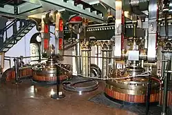 The boilers are similar to conventional Lancashire boilers, but the Galloway Company, who supplied them, modified the internal design by installing 32 cross tubes, to improve their efficiency. Each is 29 feet (8.8 m) long, 7 feet (2.1 m) in diameter, and is encased in a brick lining to conserve heat. Each has two fire boxes, 6 by 3 feet (1.8 by 0.9 m), and holds 3,200 imperial gallons (15,000 L) of water. Two of the boilers are in original condition, while the remainder had their hearths replaced in 1920.[5] They supplied steam at 50 psi (3.4 bar) to cylinders which are 46 inches (120 cm) in diameter and have a stroke of 7.5 feet (2.3 m). Each engine has a flywheel which is 20 feet (6.1 m) in diameter, and weighs 24 tons. The beams weigh 13 tons and are 25 feet (7.6 m) long. They drove a main pump, which raised water from the wells, which are 200 feet (61 m) deep,[6] and had a supplementary pump, which pumped the water up to the reservoir. Each pump could raise 1.5 million imperial gallons (6.8 Ml) of water per day.[7]